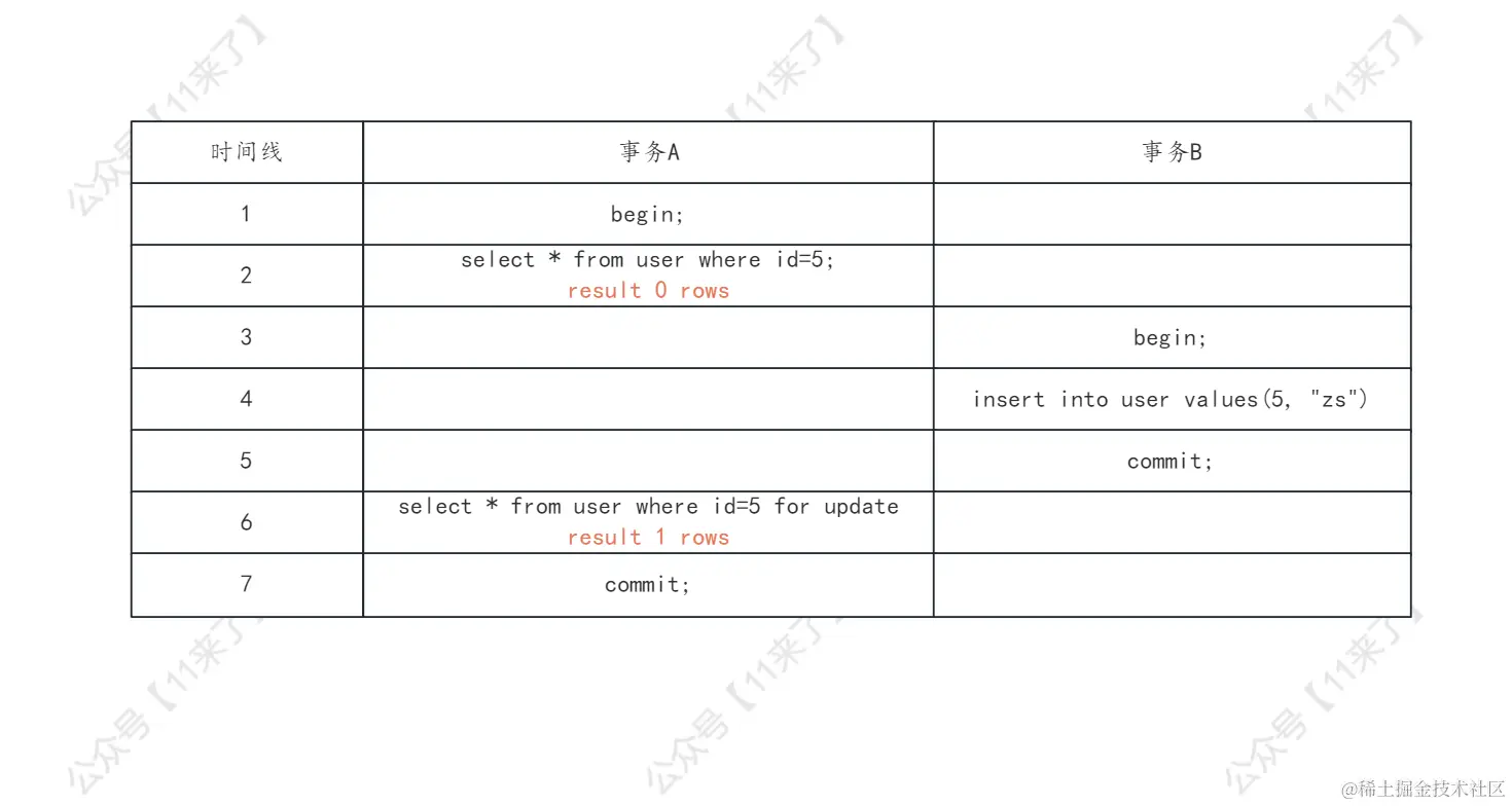 在可重复读隔离级别下,使用了 MVCC 机制,select 操作并不会更新版本号,是快照读(历史版本),执行 insert、update 和 delete 时会更新版本号,是当前读(当前版本),因此在事务 A 执行了第 6 行的 update 操作之后,更新了版本号,读到了 id = 5 这一行数据的最新版本,因此出现了幻读!