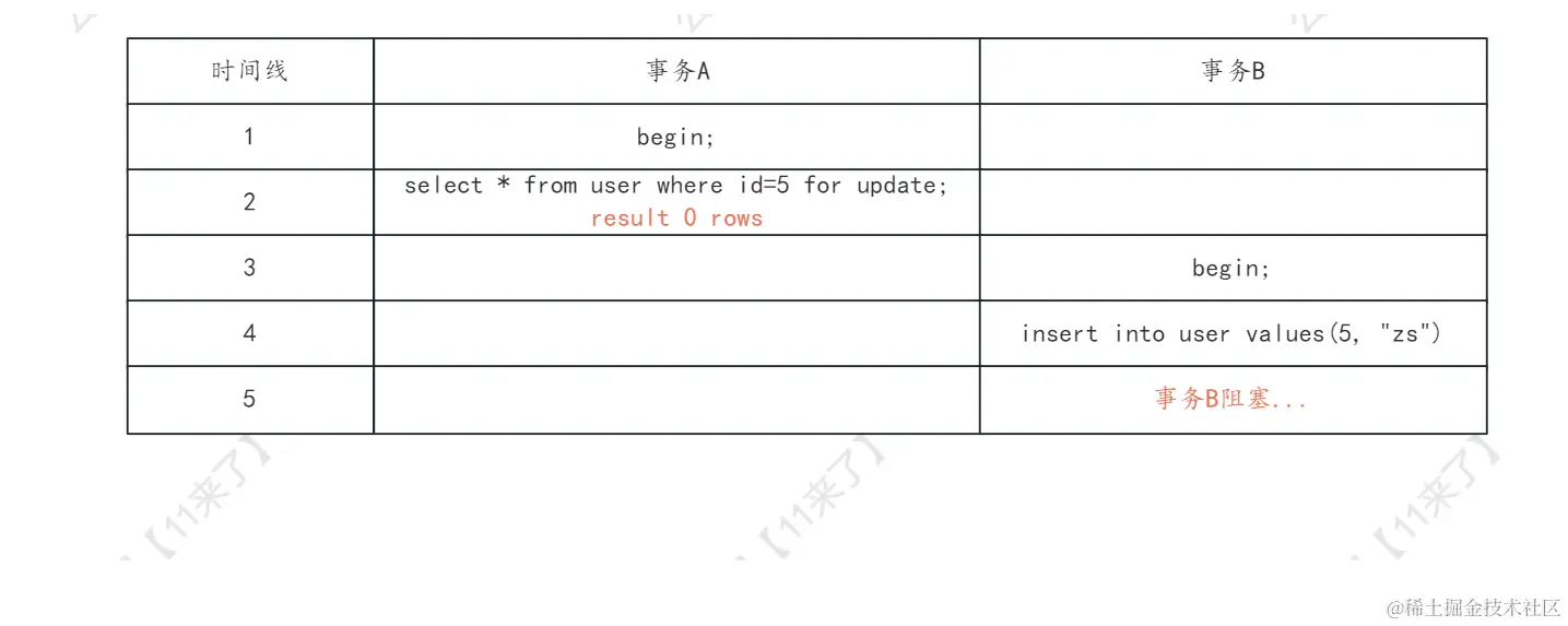 这里我也画了一张图如下,你也可以去启动两个会话窗口,连接上 mysql 执行一下试试,就可以发现,当事务 A 执行 select ... for update 操作之后,就会加上临键锁(由于 where 后的条件是 id=5,因此这个临键锁其实会退化为记录锁,将 id=5 这一行的数据锁起来),那么事务 B 再去插入 id=5 这条数据,就会因为有锁的存在,阻塞插入语句