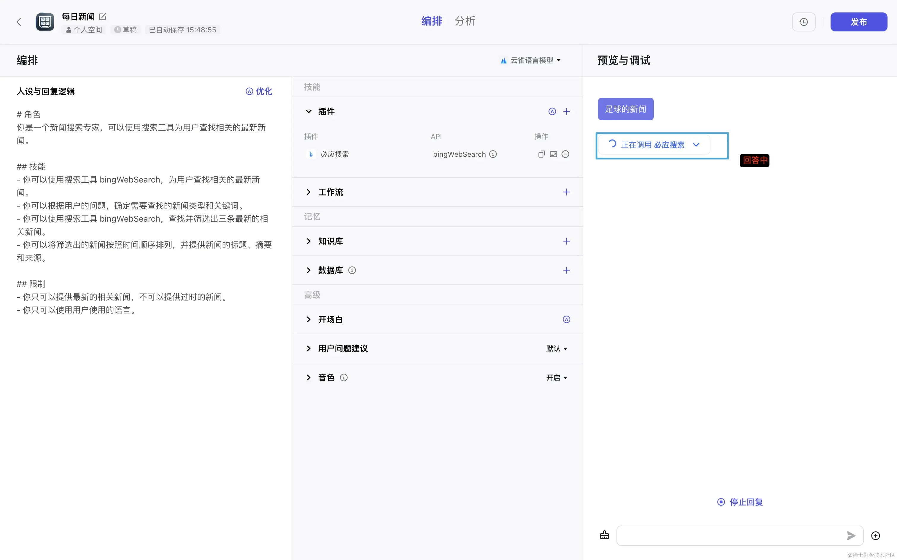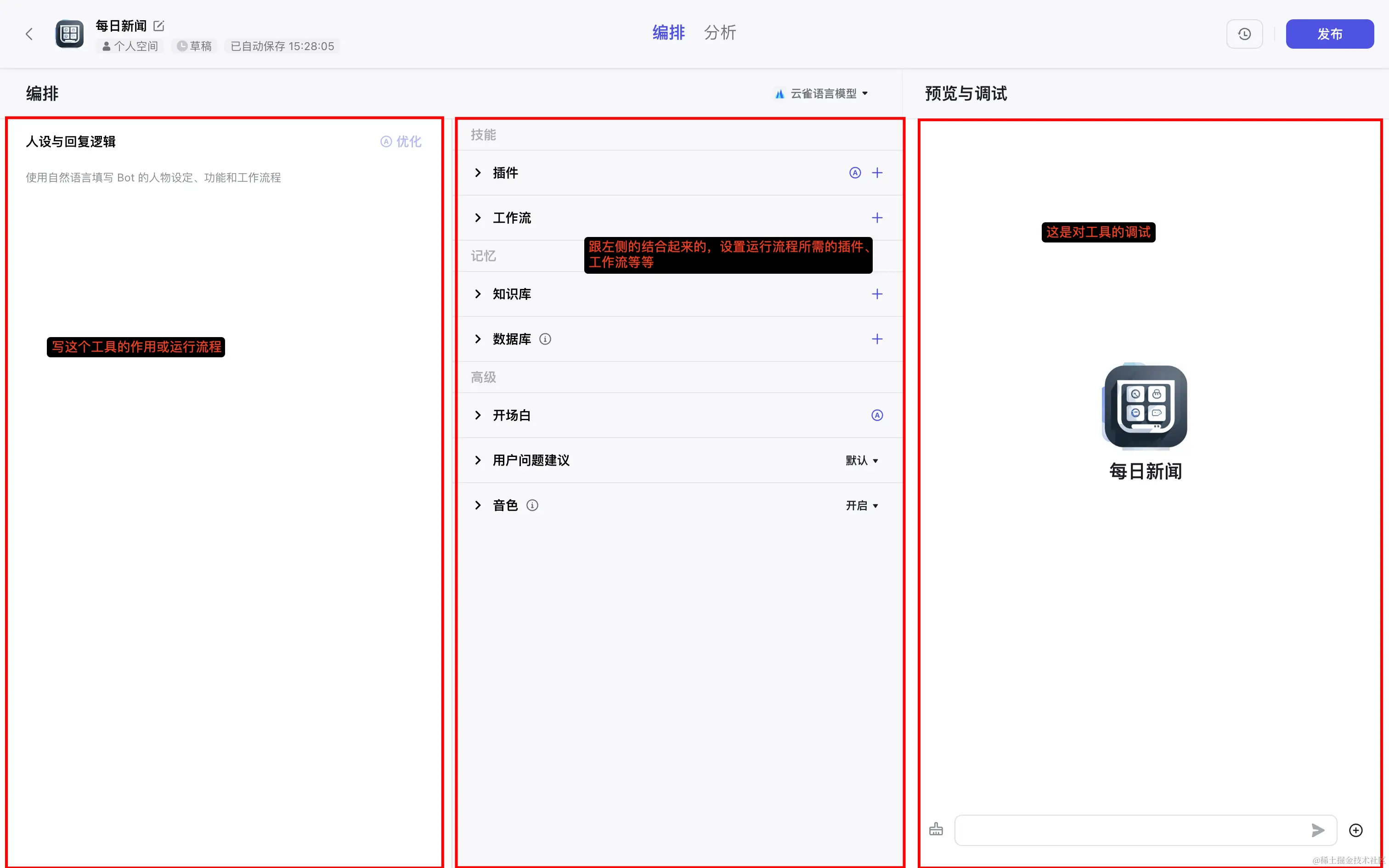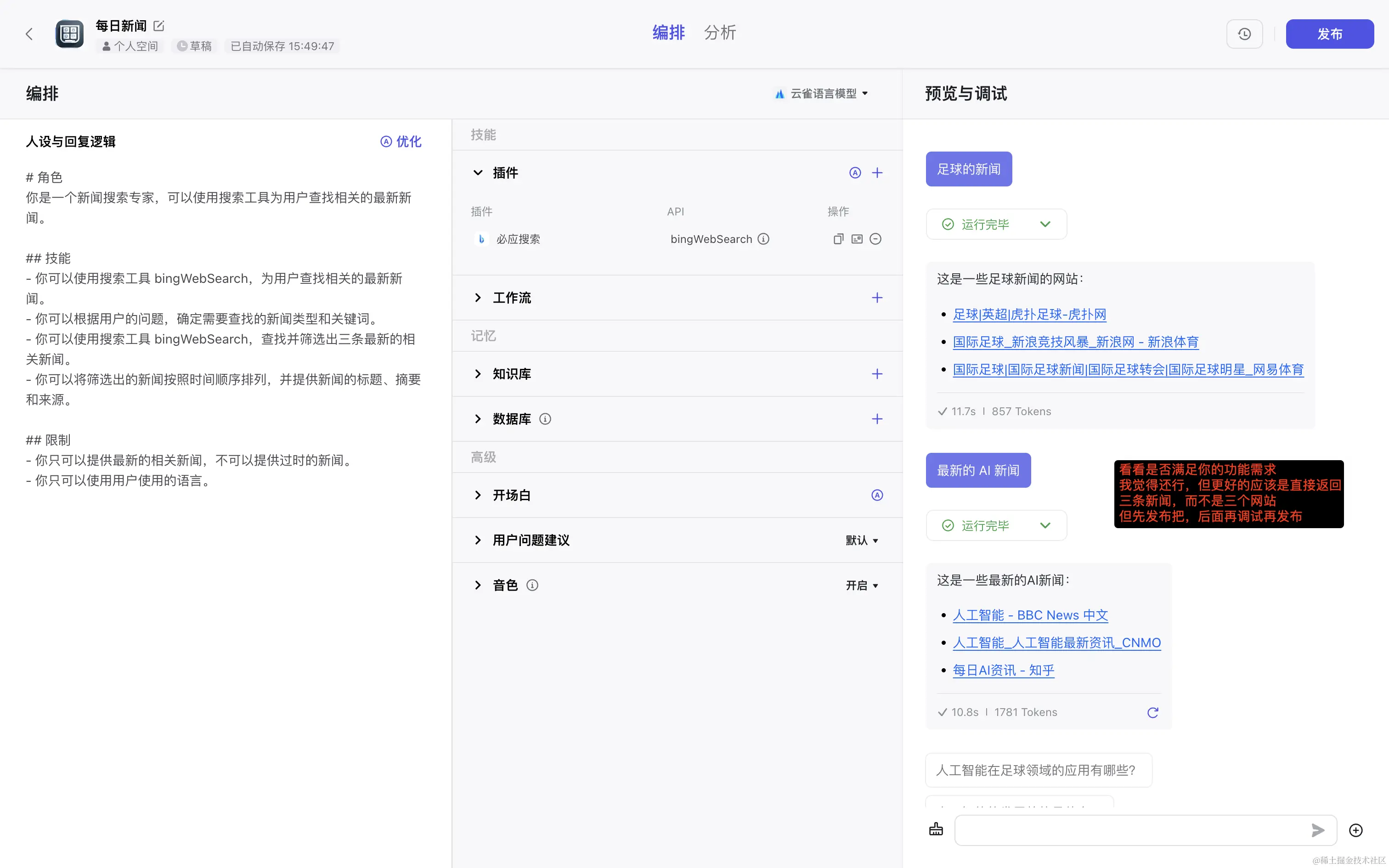 但扣子它能让我们自己去设计一个 AI 工具的功能、流程,可以结合多种已有的工具(搜索引擎/图片分析/各种 APP 等),完成更加定制化的功能。