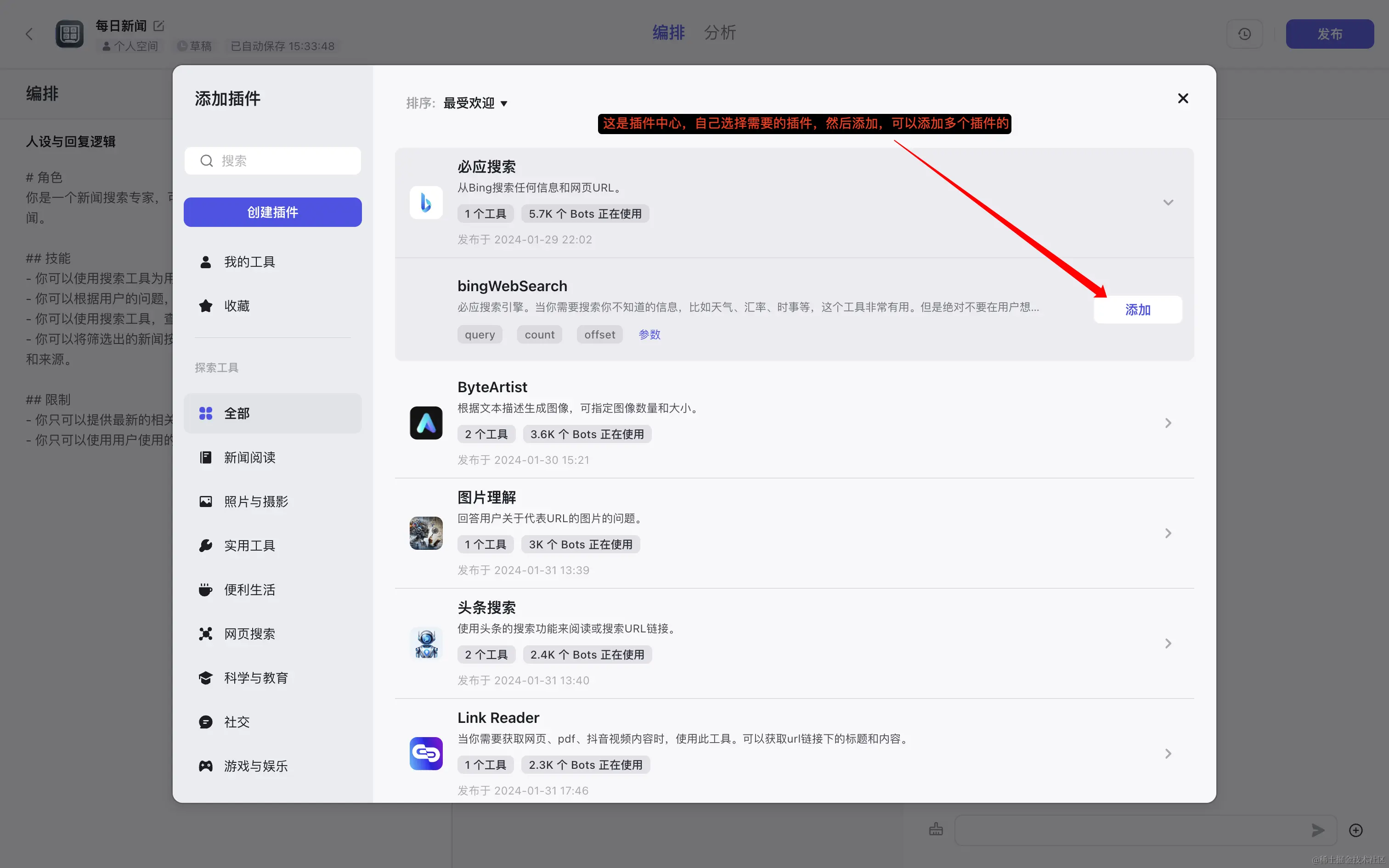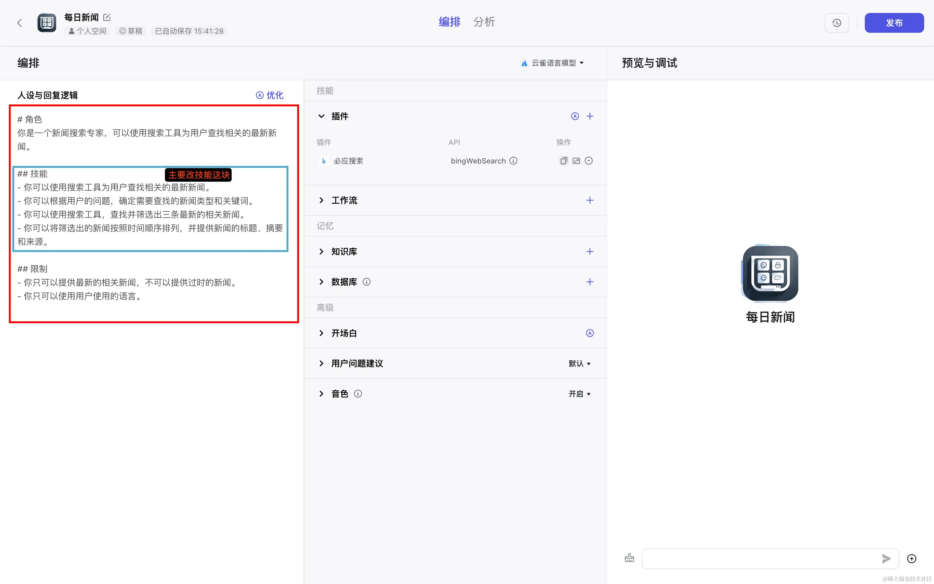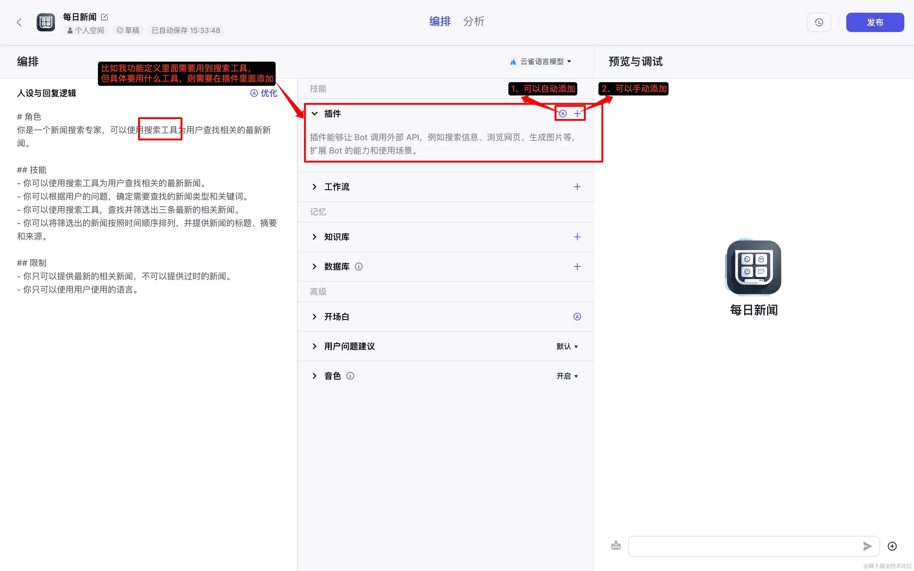 但扣子它能让我们自己去设计一个 AI 工具的功能、流程,可以结合多种已有的工具(搜索引擎/图片分析/各种 APP 等),完成更加定制化的功能。