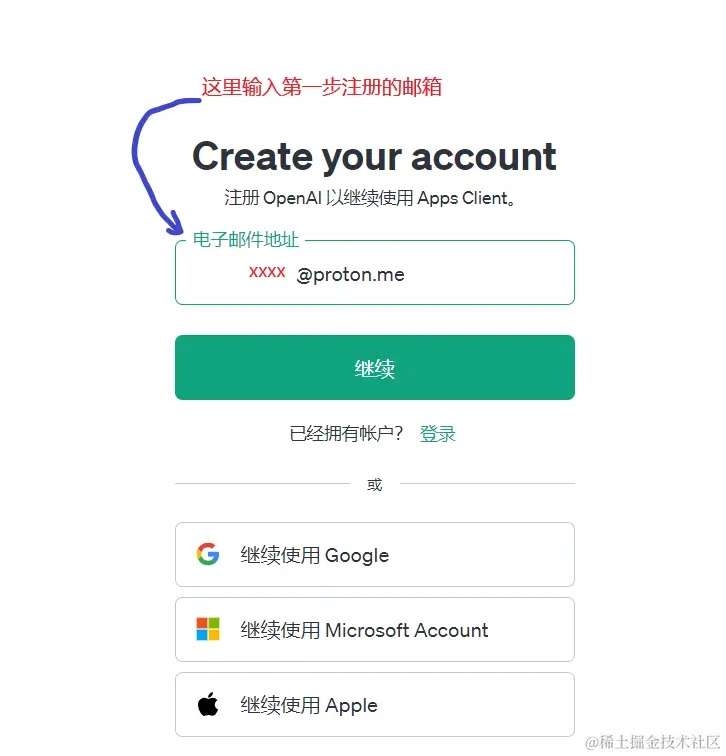 1.输入网址: chat.openai.com/ 进入openai官网,点击创建账号后,输入刚才注册的邮箱地址,然后点击继续: