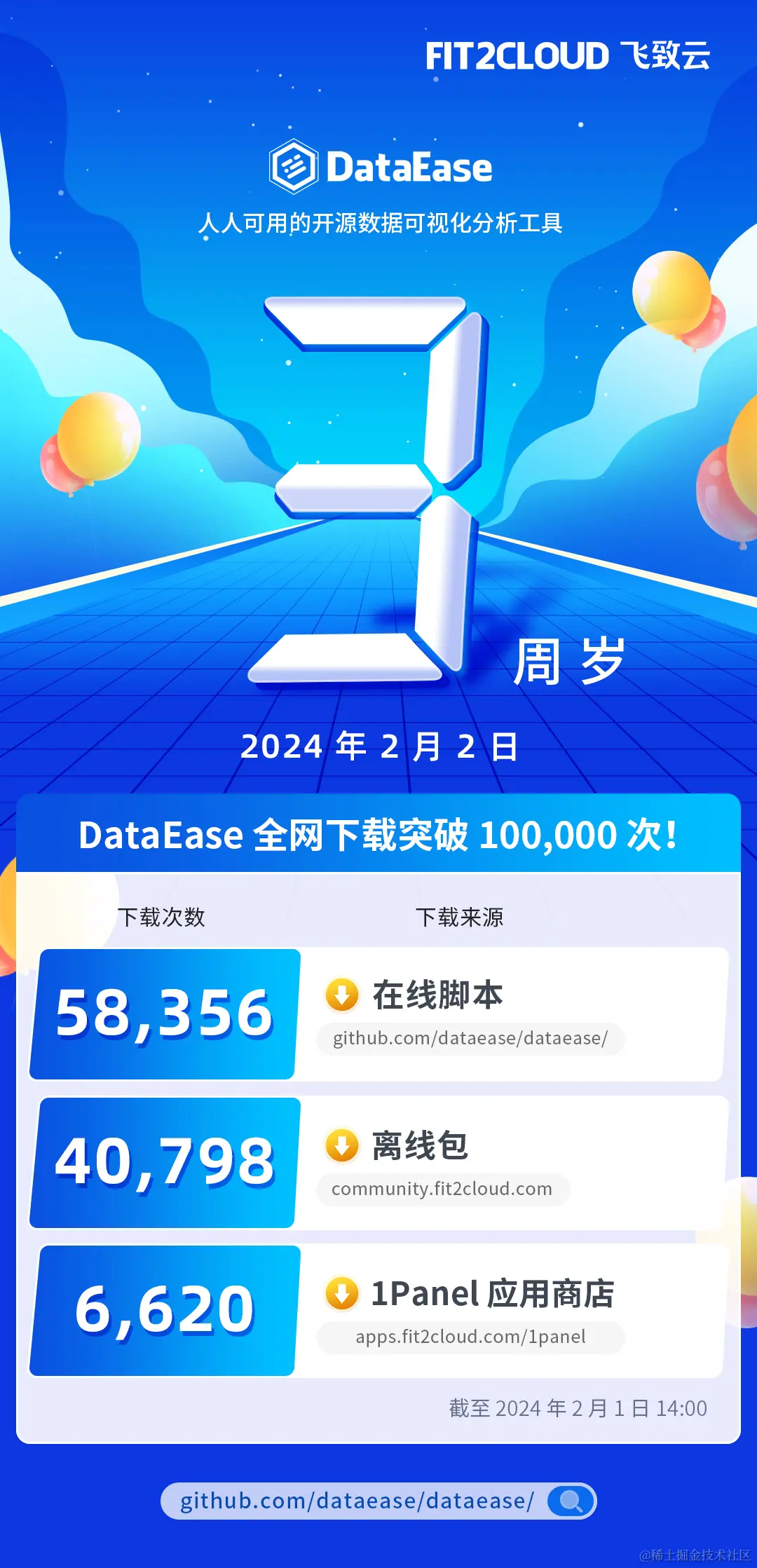 DataEase开源项目三周岁生日快乐!全网下载超过100,000次!