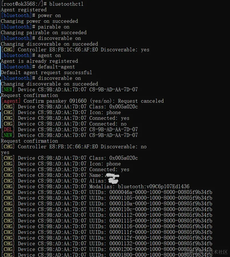 然后让OK3568-C开发板连接手机的蓝牙地址,指令如下: