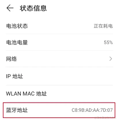 可以在手机的【设置→关于手机→状态信息】里查看手机的蓝牙地址: