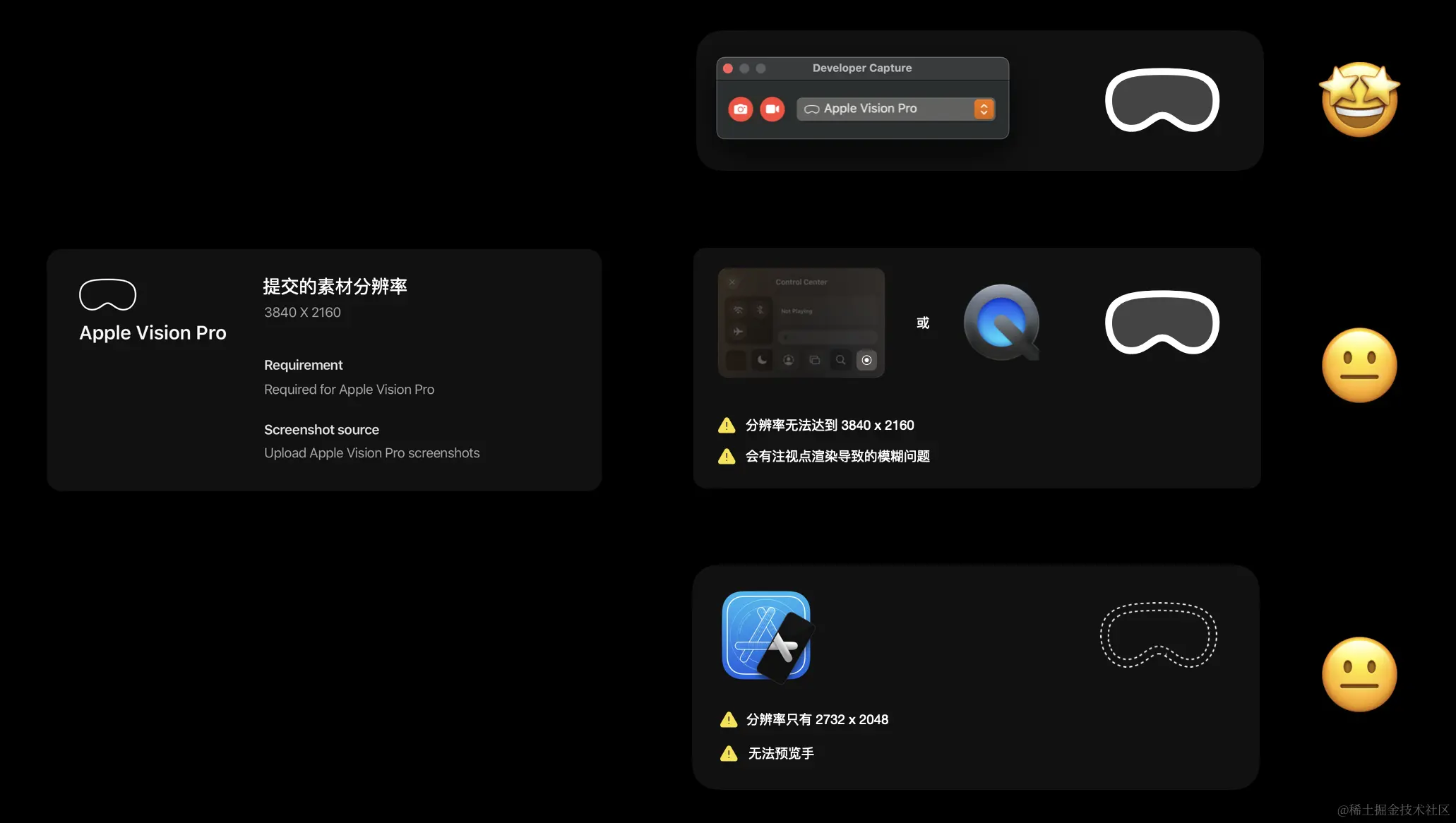 - 如果你已经有 Apple Vision Pro,可以利用设备上控制中心的录制按钮,或者使用 Mac 上的 QuickTime 进行录制,但我们并不推荐最终使用这种方式产出而视频和截图,因为: