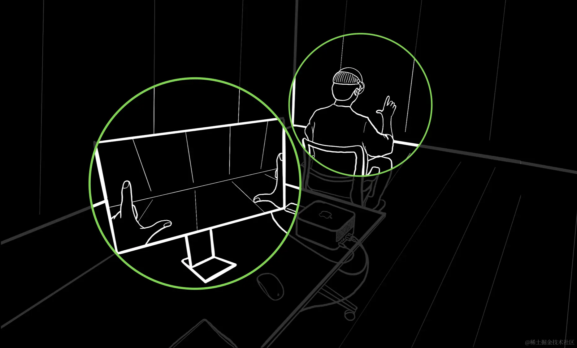 因为室内场景更具可控性,同时利用 Reality Composer Pro 进行录制的过程中需要 Mac 的配合,所以我们建议在室内场景进行录制。如果 App 包含桌面上的空间体验,可以再摆设一张整洁的桌子于拍摄者前方。建议拍摄画面覆盖宽 4 ~ 5 米的墙面,录制者座椅距离墙面 2 ~ 3 米。需要特别注意的是,因为录制开始、结束时 Apple Vision Pro 上不会有明显的提示,建议找一个小伙伴在电脑前配合录制。