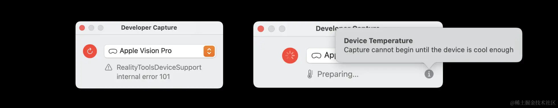 当 Apple Vision Pro 已经打开“开发者模式”,且通过 Xcode 与 Mac 完成了无线连接后,Developer Capture 便会显示录制程序画面。需要注意的是: