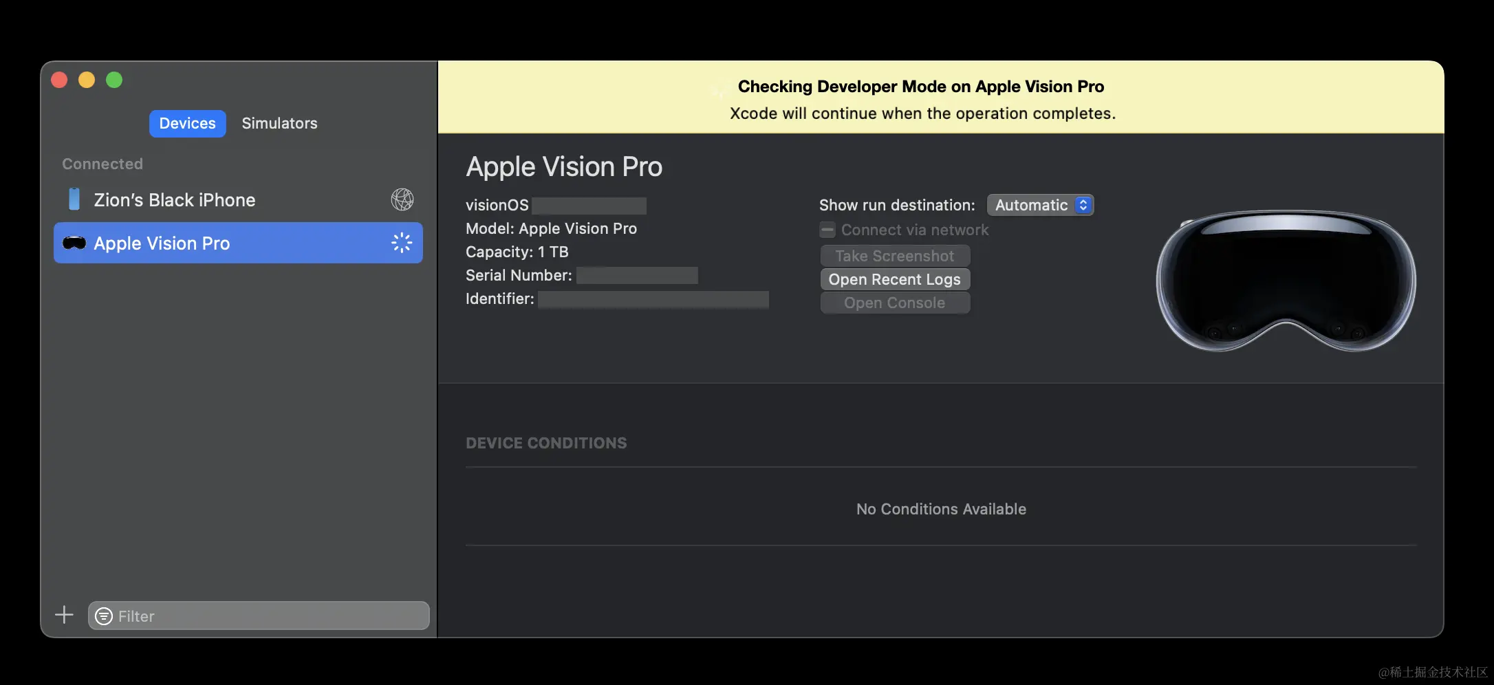 难道说,到手的 Apple Vision Pro 竟然无法调试了?别慌别慌,在 Apple 的官方文档 中,我们可以找到借助无线连接来进行调试的步骤。具体来说,我们需要: