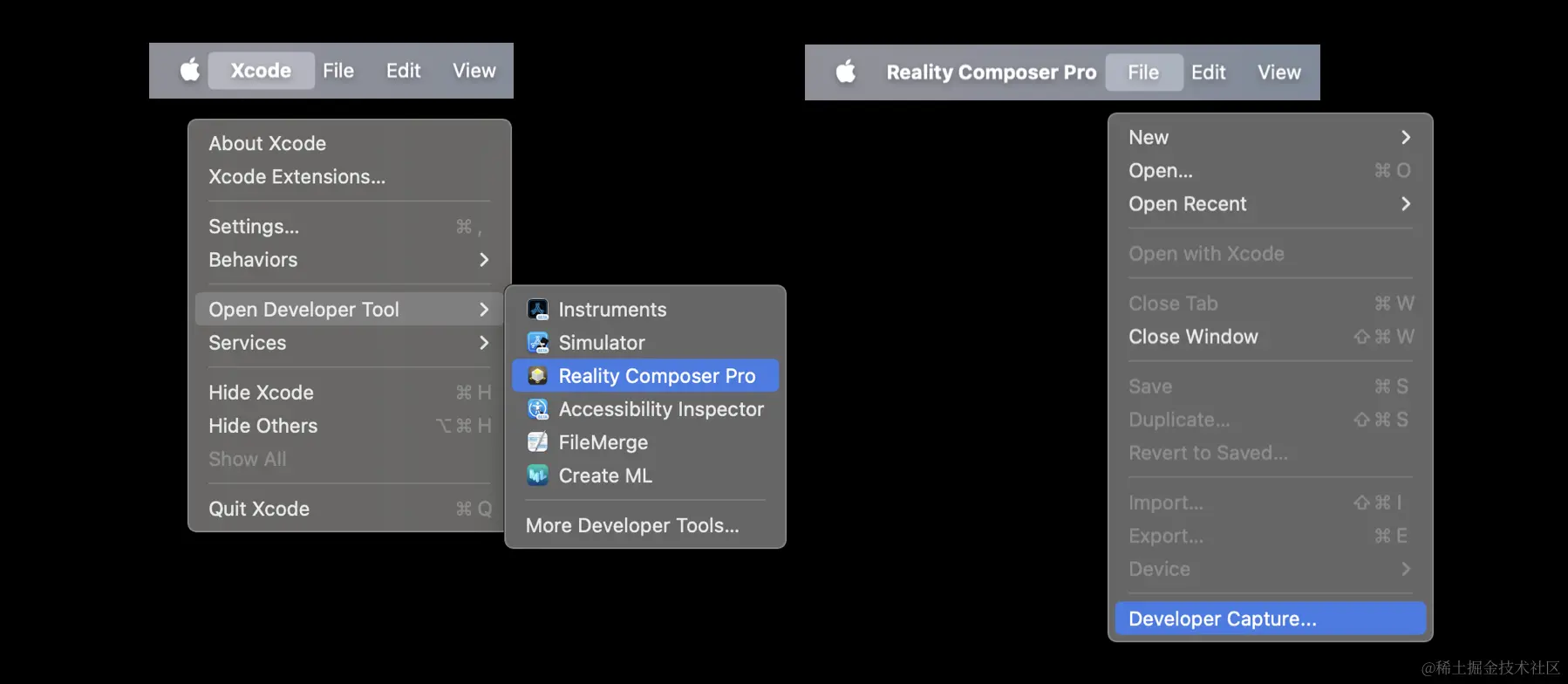 如果你已经确定要使用 Reality Composer Pro 进行录制,那么你可以通过 Xcode 找到 Reality Composer Pro。打开 Reality Composer Pro 后,不需要创建任何工程,直接在 File 下方就可以找到 Developer Capture 按钮。
