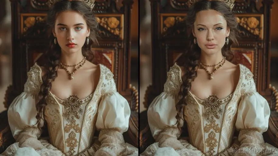 我尝试将好莱坞女星 Angelina Jolie 的脸部特征融合到了由 Midjourney 生成的多个图片中,包括一名中世纪女战士、一幅文艺复兴时期的美女肖像,以及一位女王的形象,效果都非常令人满意。