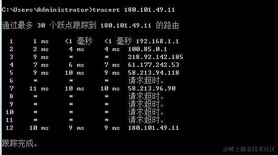 比如我们还是跟踪什么的IP地址,我们可以看到具体的跟踪路径地址。当网络反应慢的时候,返回的数值就是请求超时。通常10个节点左右跟踪完成的IP地址或者网站,访问速度都是较好的。
