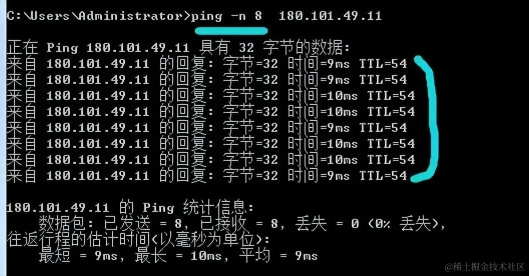 我们从上图也可以看出默认情况下只会发送4个数据包,如果要返回多个数据包,可以通过ping -n来实现。如下图: