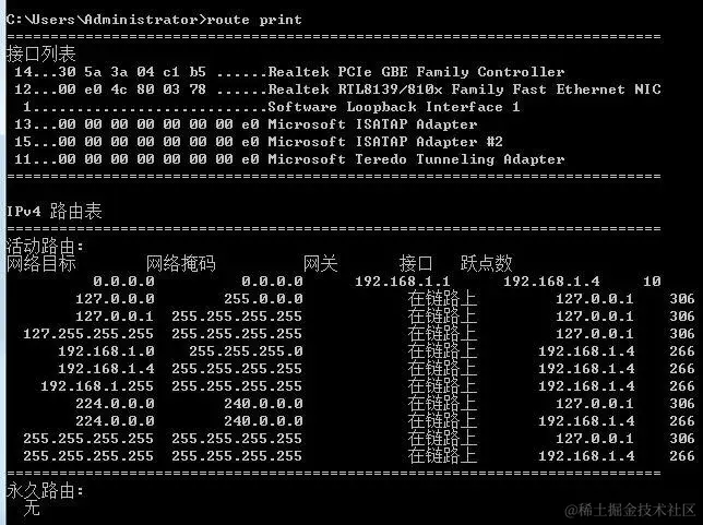 我们可以对本机的路由表查看和修改。查看路由表的命令为:route print