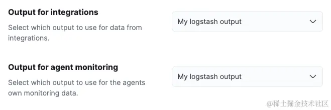 2)设置 Output for integrations 及(可选)Output for agent monitoring 以使用你之前创建的 Logstash 输出。 你可能需要向下滚动才能看到这些选项: