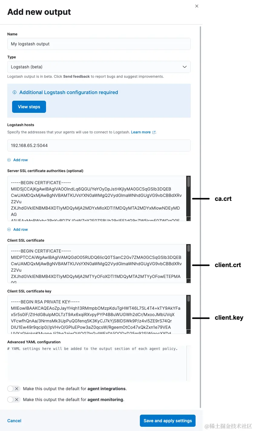 mylogstashhost:5044。参考[链接](https://www.elastic.co/guide/en/fleet/8.12/ls-output-settings.html "链接") - 在 Server SSL certificate authorities 字段中,粘贴你之前生成的 ca.crt 文件的全部内容。