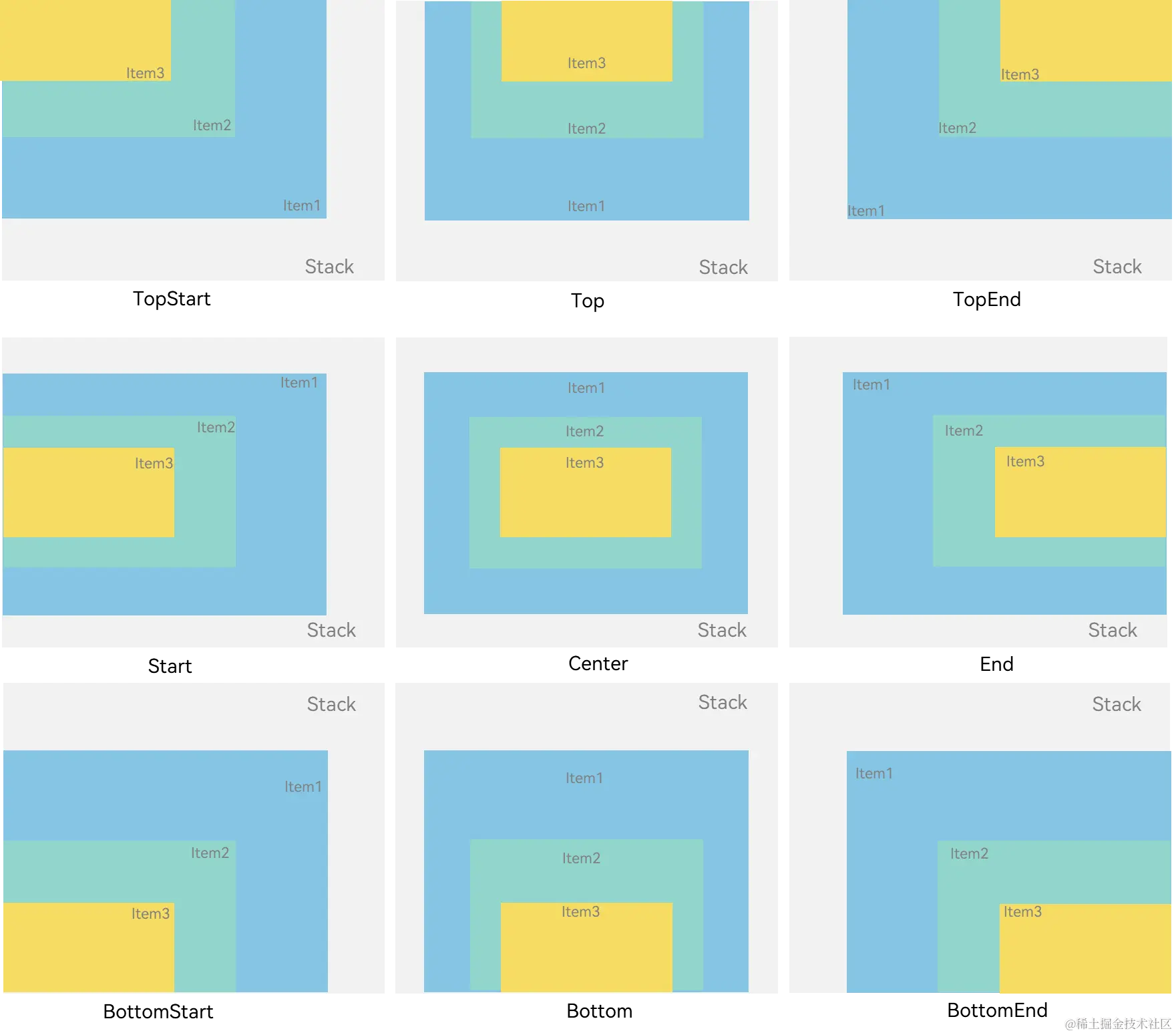 Stack组件通过alignContent参数实现位置的相对移动。如图2所示,支持九种对齐方式。