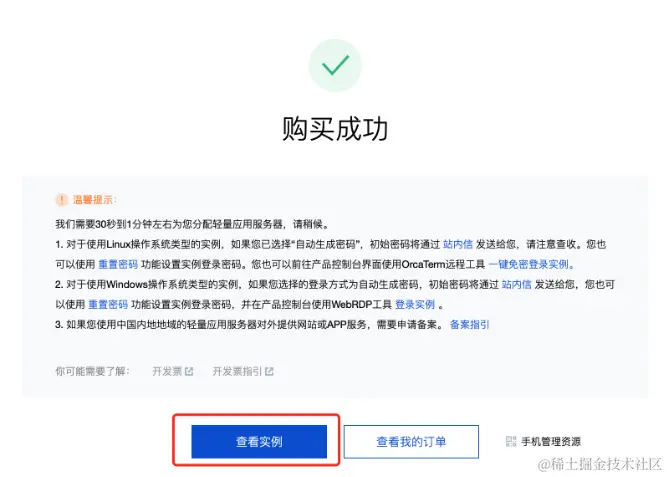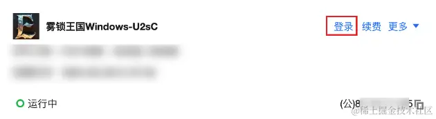找到《雾锁王国》部署完成的提示,这里有服务器登录账号和密码,回到之前的实例卡片界面: