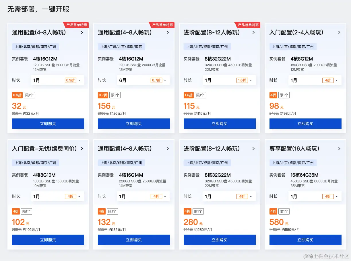 选择好游戏之后,下面会展现支持的规格(如下图所示),根据一起玩的人数来选择配置即可: