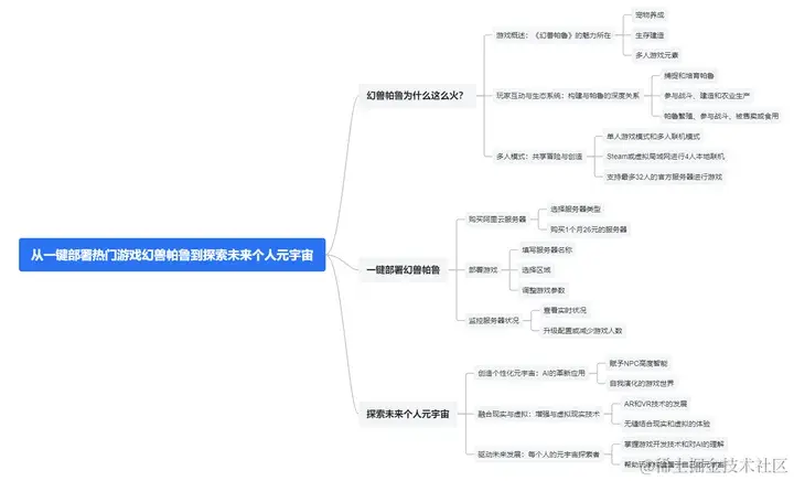 写这个部署体验教程时候,我一直思考作为一个中年程序员,游戏爱好者来说,我到底应该写什么样的内容?以阿里云这种快捷部署游戏服务器的模式,对我们有哪些影响,于是我先起草了一个思维导图,通过思维导图大家可以快速了解下我的创作思路。