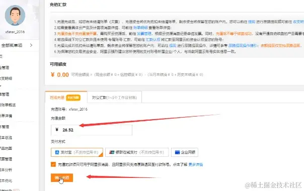 点击立即创建后,就到了这个页面,这里我选定支付宝来支付,点击确定充值,就让你扫码支付。