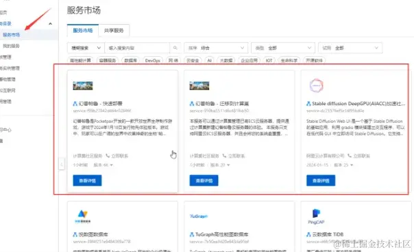 其他的功能,不是太重要我就不在这里展示了。大家也可以从左侧服务市场,了解下其他相关的可以部署的游戏和工具,你可以可以随时更换不同的应用,合理的利用我们的云服务器资源。