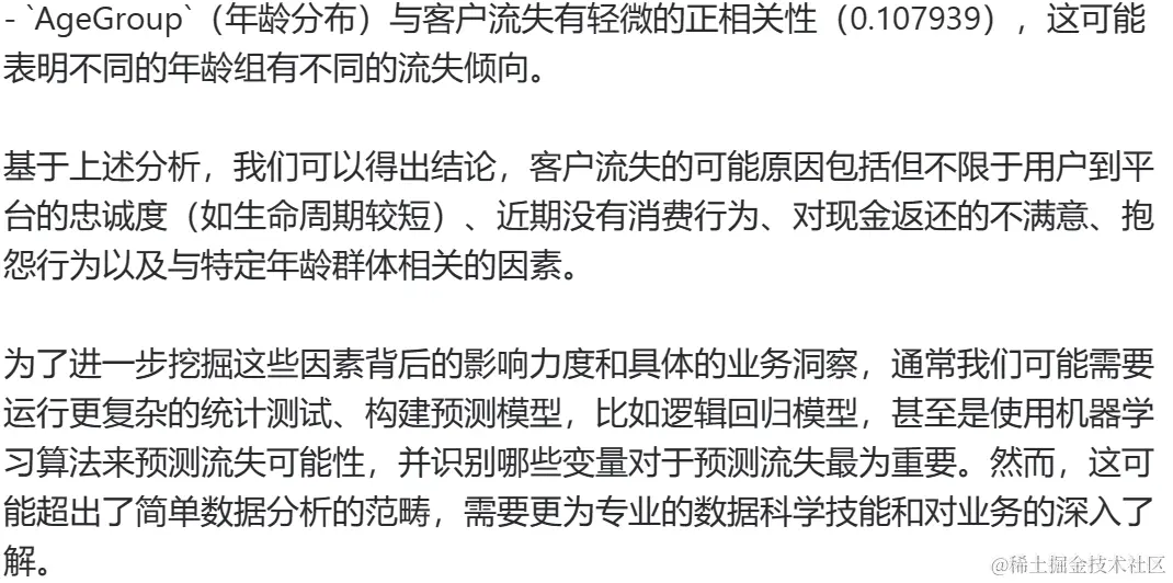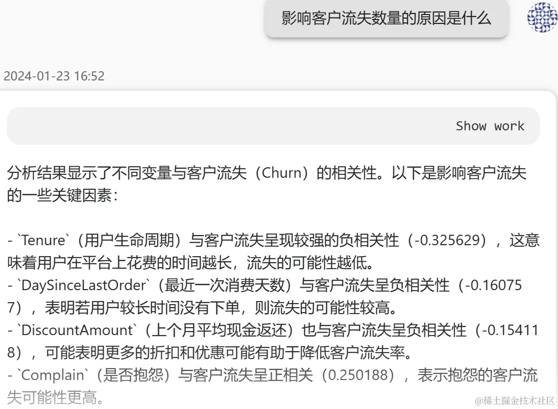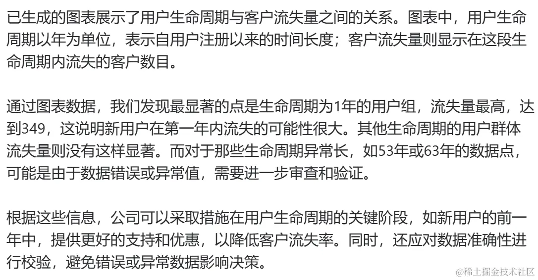 通过自然语言与DeepBI交互不仅准确的分析出了客户流失量的关键还将这些数据进行了可视化。