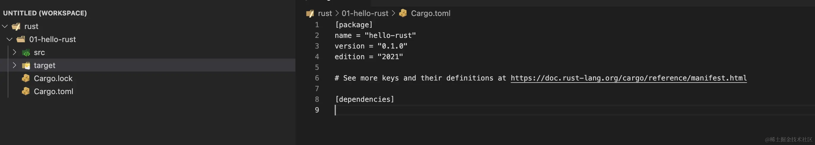 我们注意到在基础项目里有一个Cargo.toml的文件,这是在rust工程文件使用cargo创建项目后生成的文件,其中有默认的几个参数