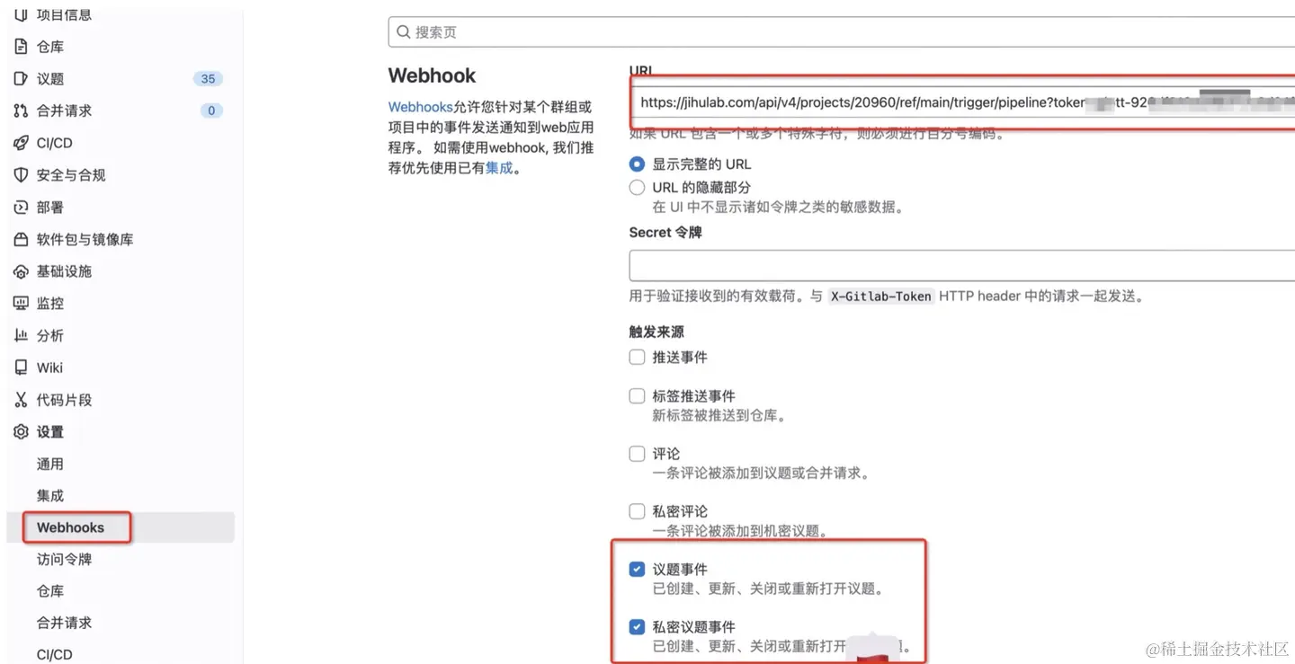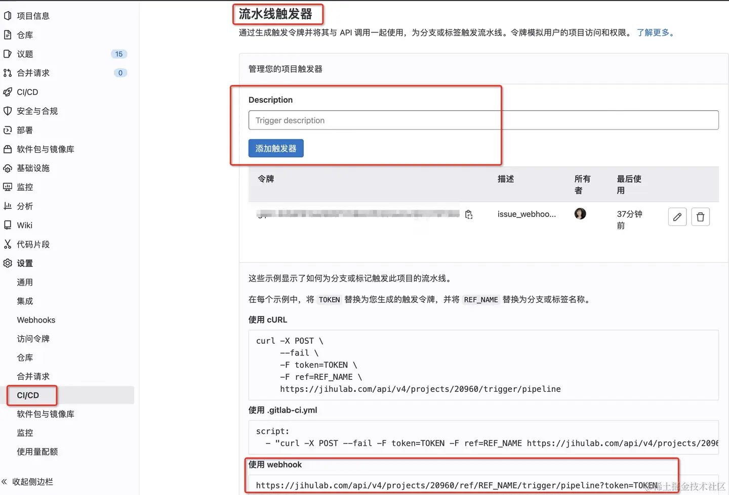 设置 -> CI/CD -> 流水线触发器 -> 添加触发器 -> 复制触发令牌