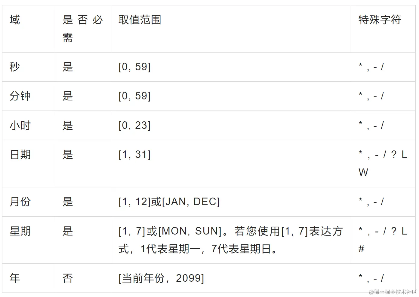 下表为Cron表达式中六个域能够取的值以及支持的特殊字符。