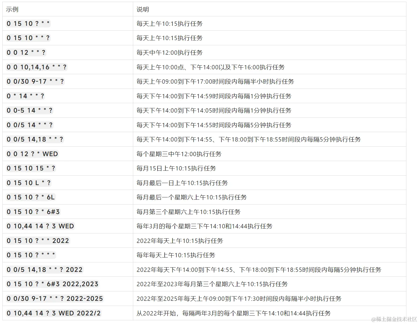 以下为Cron表达式的取值示例。