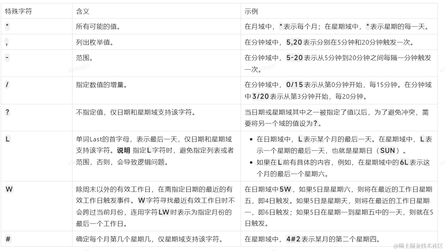 Cron表达式中的每个域都支持一定数量的特殊字符,每个特殊字符有其特殊含义。