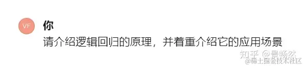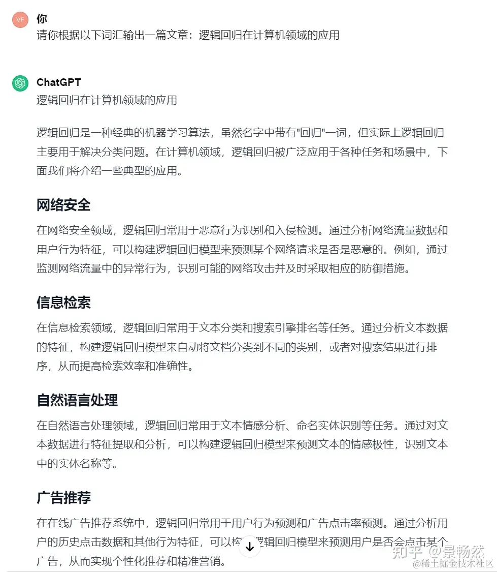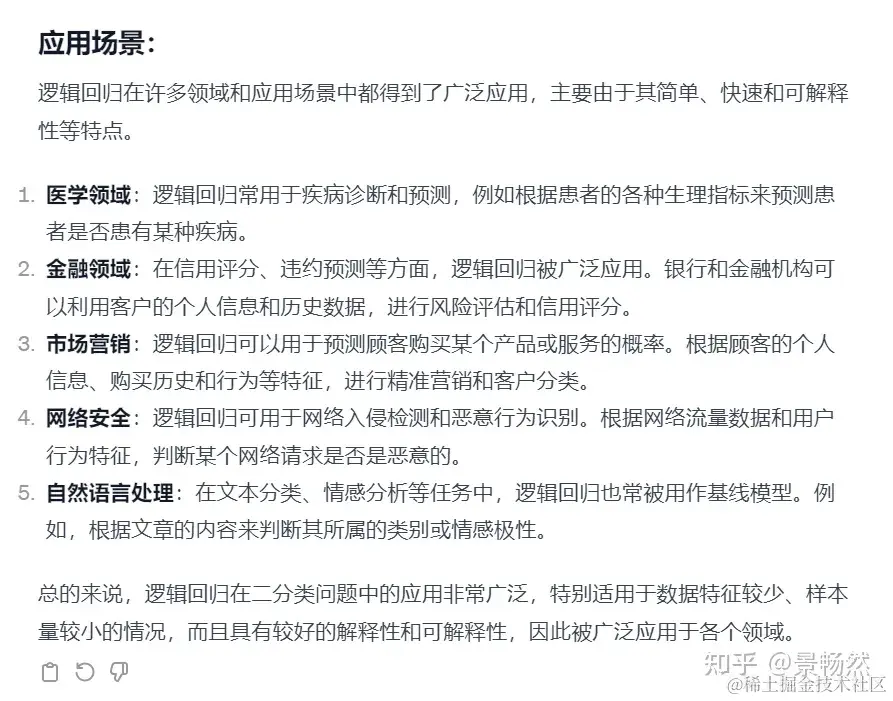 使用公式:请你完成「任务」,按照「细节」中的要求输出。 这种方法适用于GPT的回答太过粗浅、颗粒度不够细的情况下。比如,我们需要对逻辑回归的应用场景做进一步了解: