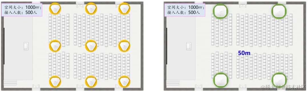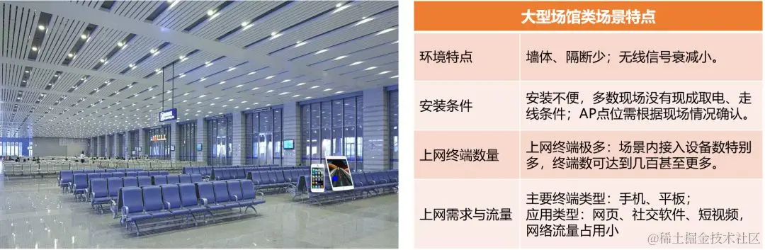 高密度AP。大型场馆,接入终端数特别多,一定要部署高密度AP,确保能接入足够多的终端。此外由于层高比较高,相邻AP间隔须保持在20米以上甚至更远,避免信道干扰。