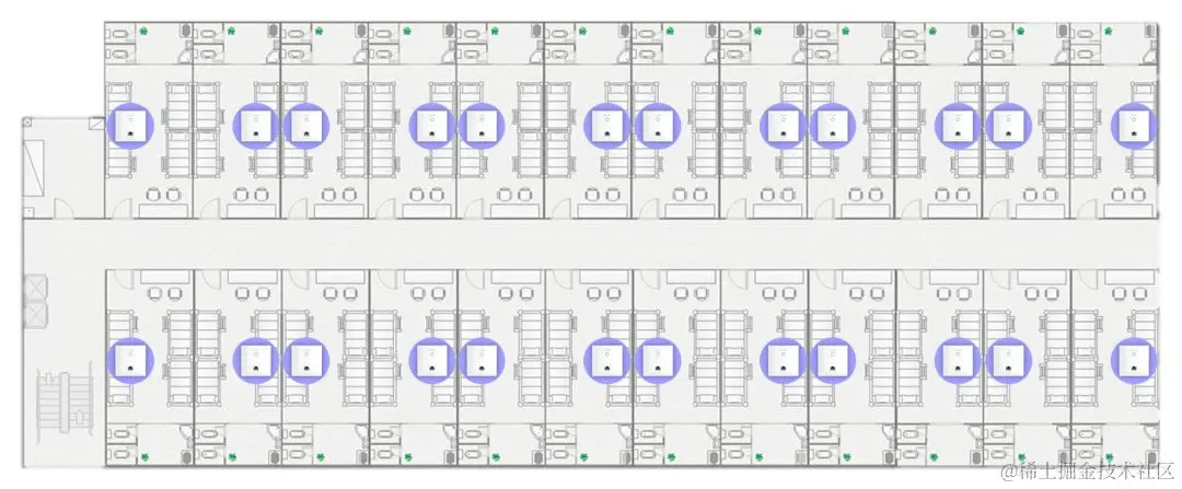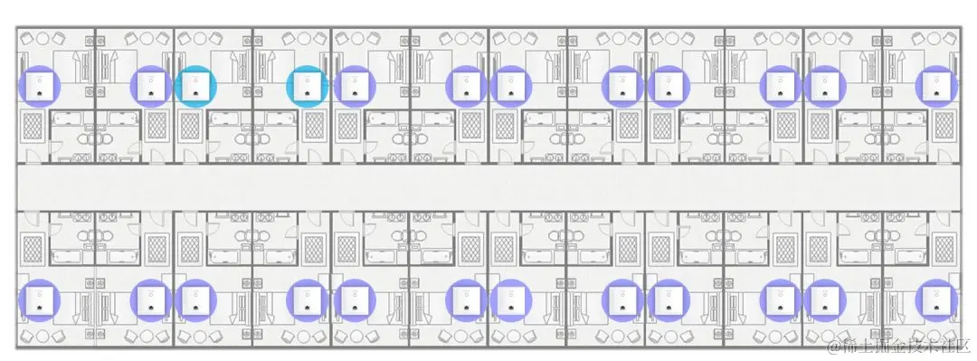 在过道和走廊安装吸顶式AP。如果房间里面没有预埋或者不好布设网线,那么也可采用这种方式,采用单个AP覆盖单侧三个房间,AP选用双频的。
