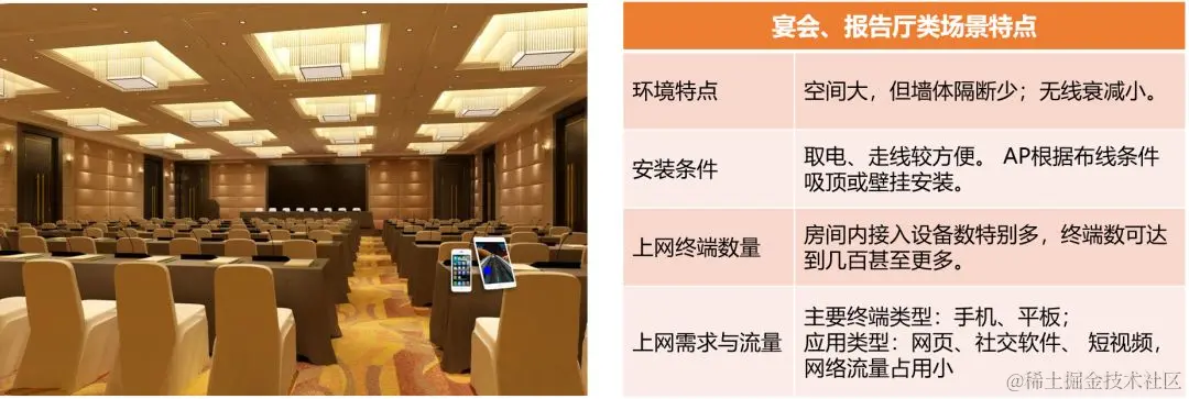 高密度AP或双频无线AP。宴会厅、报告厅类的场景,空间很大,终端连接数极多。为保证覆盖效果,区域内需要AP数量可以结合房间面积、使用人数来计算。