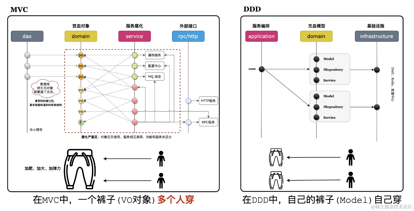 在 MVC 的分层结构就像家里所有人的衣服放一个大衣柜、所有人的裤子放一个大库柜。衣服裤子(对象),很少的时候很节省空间,因为你的裤子别人可能也拿去穿,复用一下开发速度很快。但时间一长,就越来越乱了。🤨 一条裤子被加肥加大,所有人都穿。