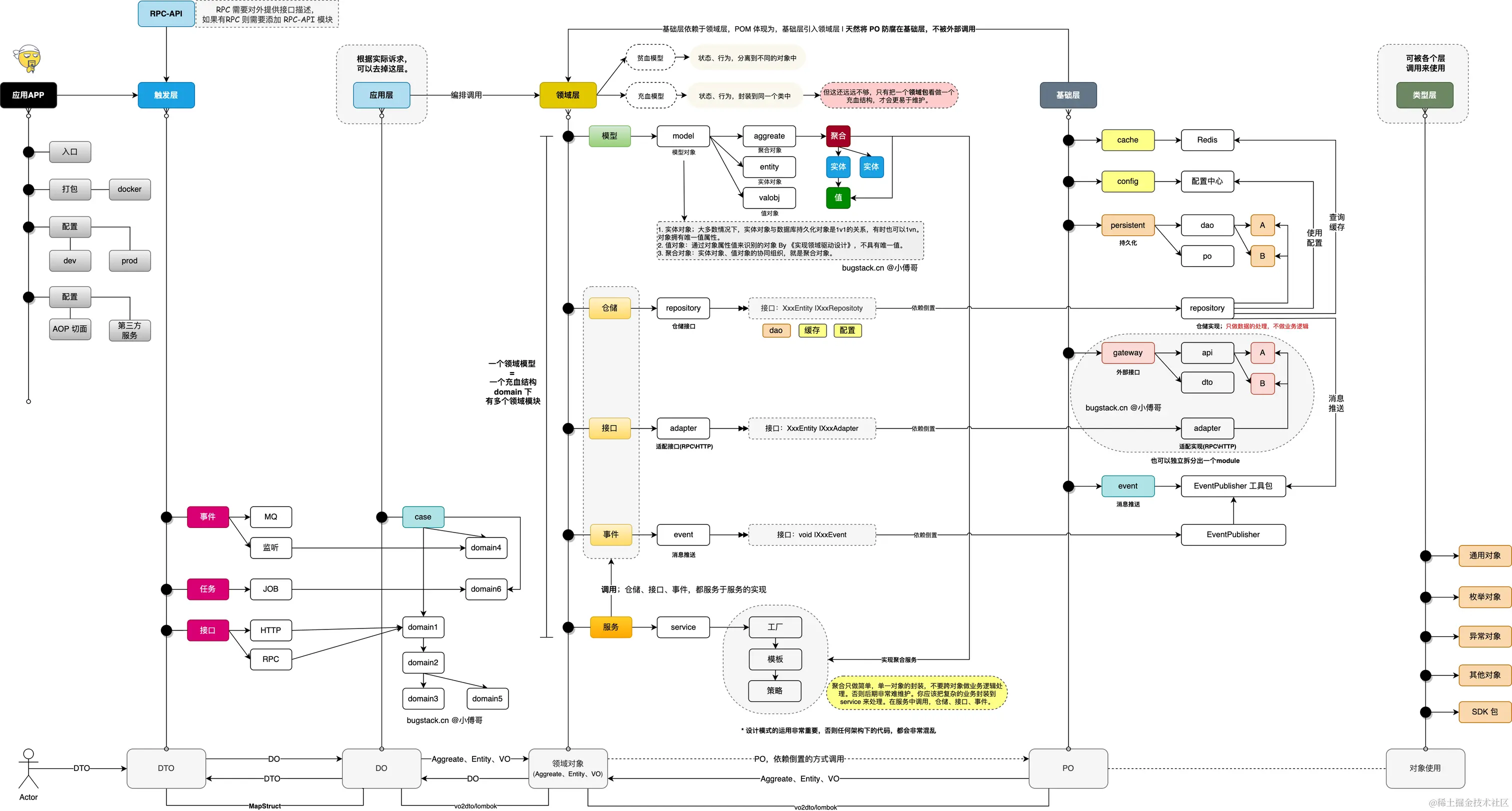 - 战术设计(设计模式): 从技术视角出发,侧重于领域模型的技术实现,完成功能开发和交付落地。领域设计的重点包括:实体、聚合对象、值对象、领域服务、仓储,还有一个非常重点的设计模式。任何一个较为复杂的领域模型实现都需要考虑设计模式的使用,否则即使战略优秀,战术也能干回 MVC 去。