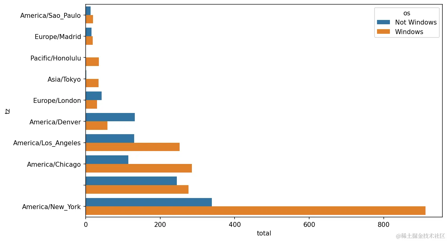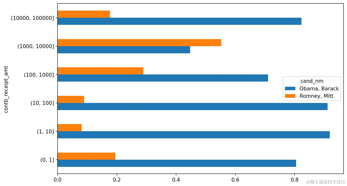 这些数据显示,奥巴马收到的小额捐款数量明显多于罗姆尼。您还可以对捐款金额进行求和,并在桶内进行归一化,以可视化每个候选人每个大小的总捐款的百分比(每个捐款大小收到的候选人总捐款的百分比显示了结果图):
