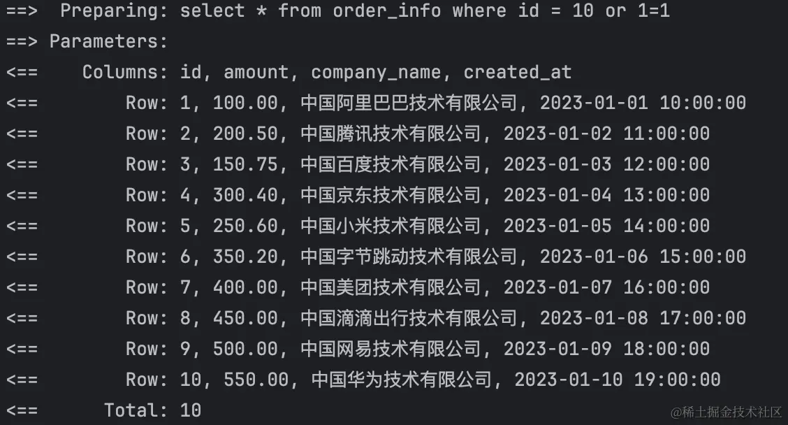 仔细看看,看出区别没,直接拼接参数的将能查出全部数据,因为or 1=1生效了,而通过?和setString拼接的则不会出现问题,因为它被包裹在''里了,而这就是SQL注入漏洞。