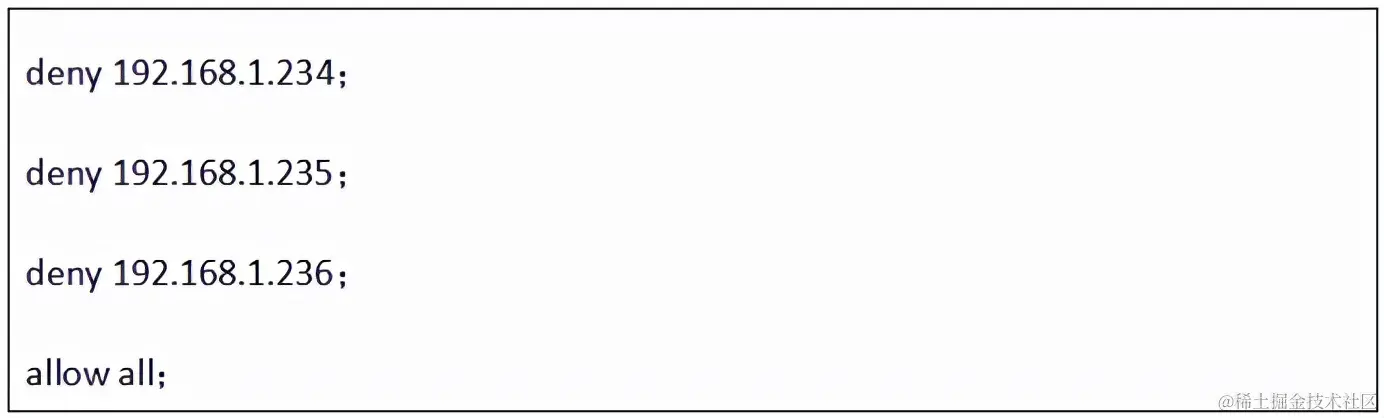 deny 172.168.22.11; # 禁止访问的ip地址,可以为all