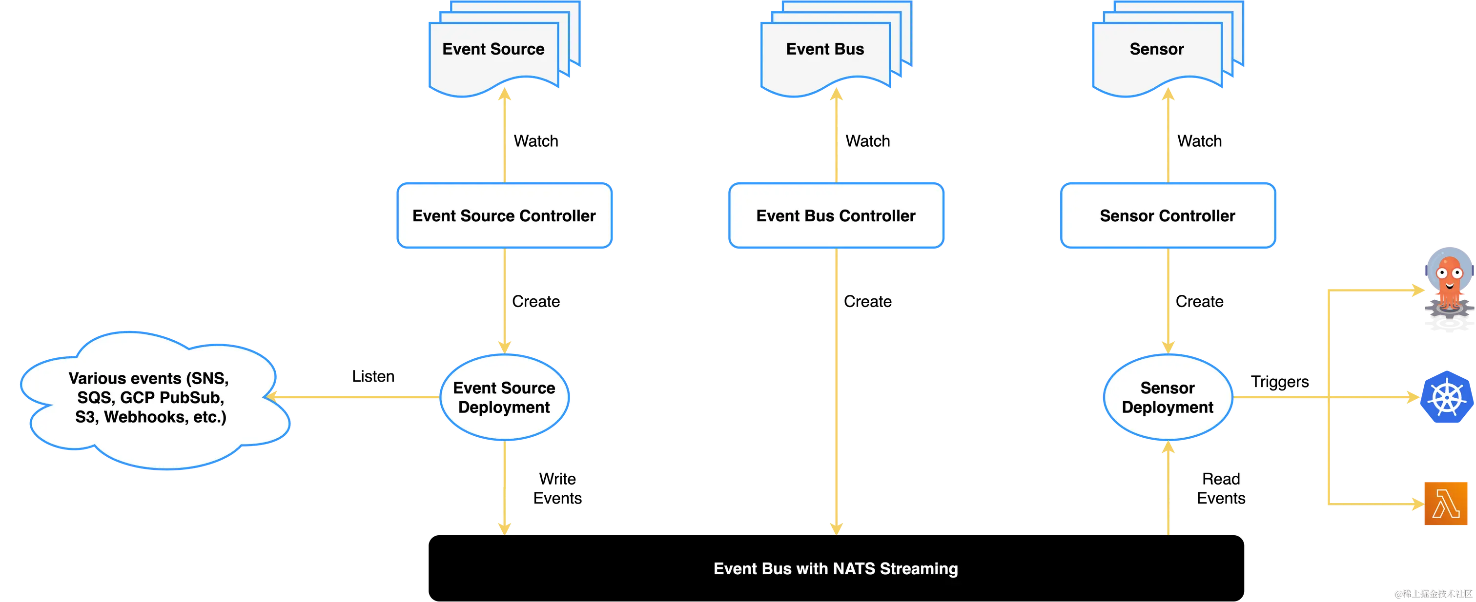 从图中可看出,event source controller主要用于收集events,controller部署了一个deployment资源专门用于监听各类事件,并且写入event bug中。event bus就是一个事件总线存储,用于存储event source controller收集到的事件信息。sensor controller监听sensor资源,并且从event bus中获取事件,若获取到sensor中匹配的事件,则创建sensor deployment用于触发事件后续操作。