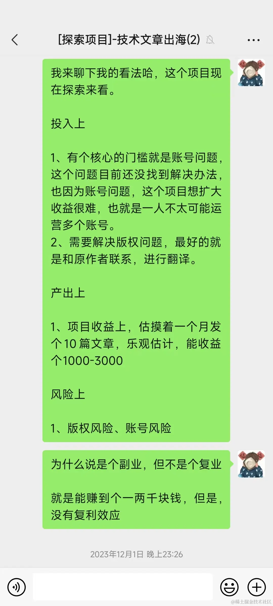 最后的结论也是,门槛较高且账号问题不好解决,加上是属于纯搬运的工作,无法产生复利效应。所以,也没有推荐给更多人,应该也没有社群的朋友,去参与做这个项目。