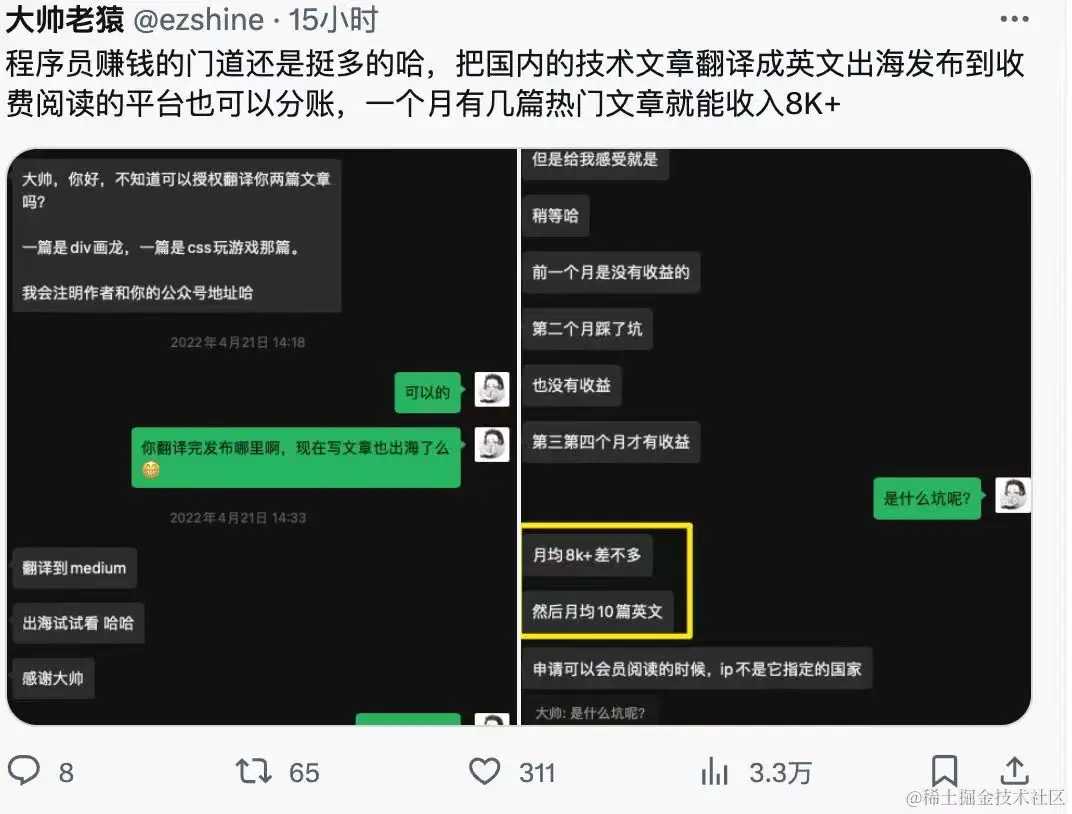 起因是在深圳生财的群看到下面左边那张图,有人在medium写技术文章,月入8千多。