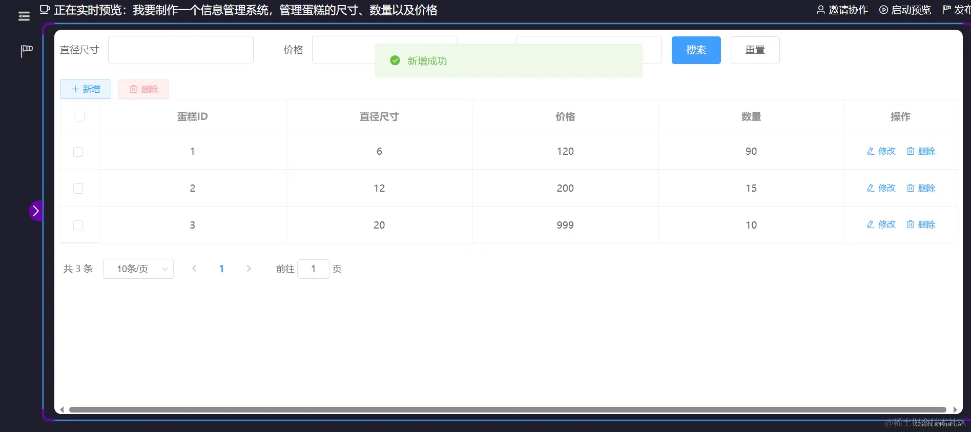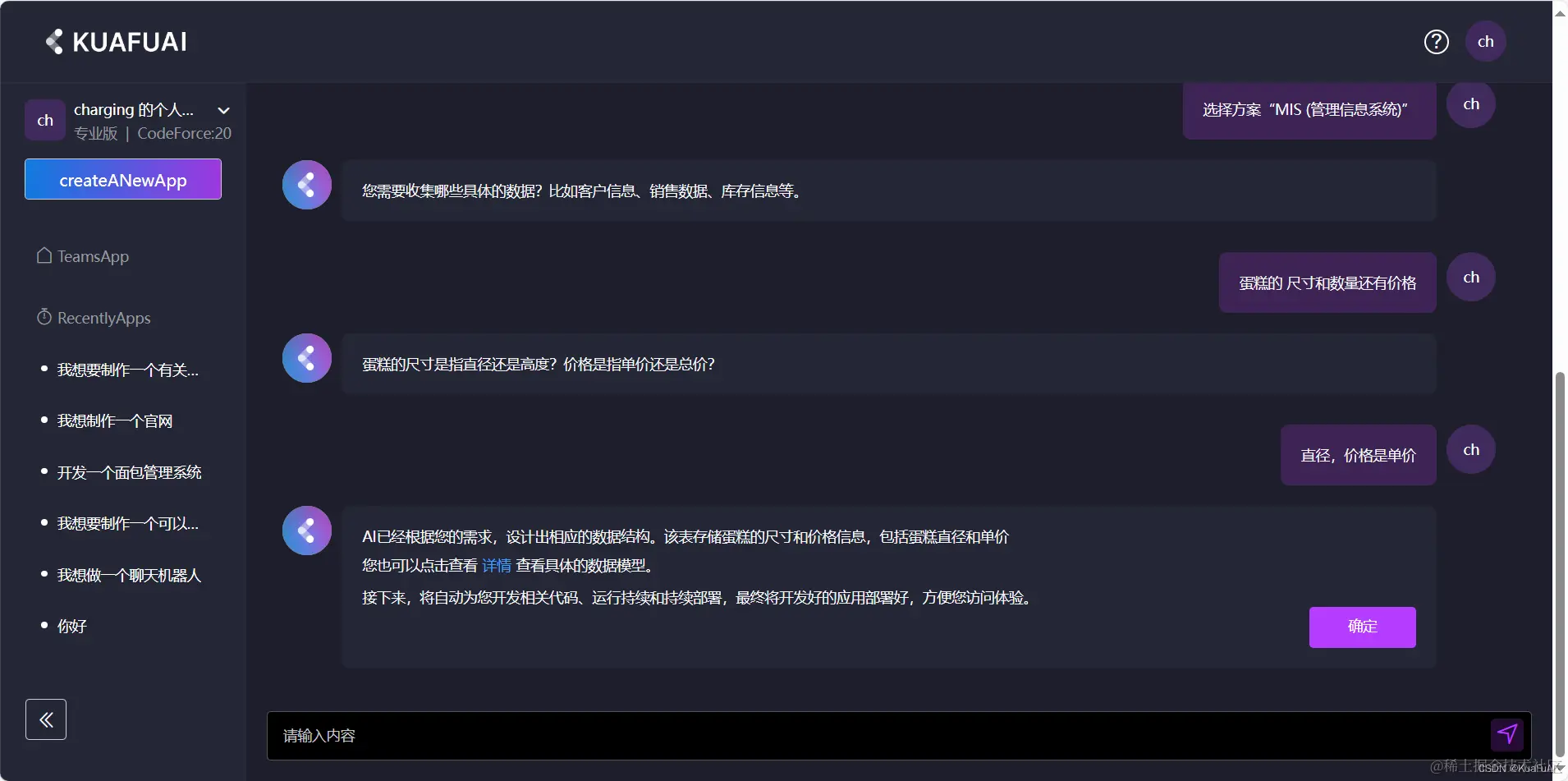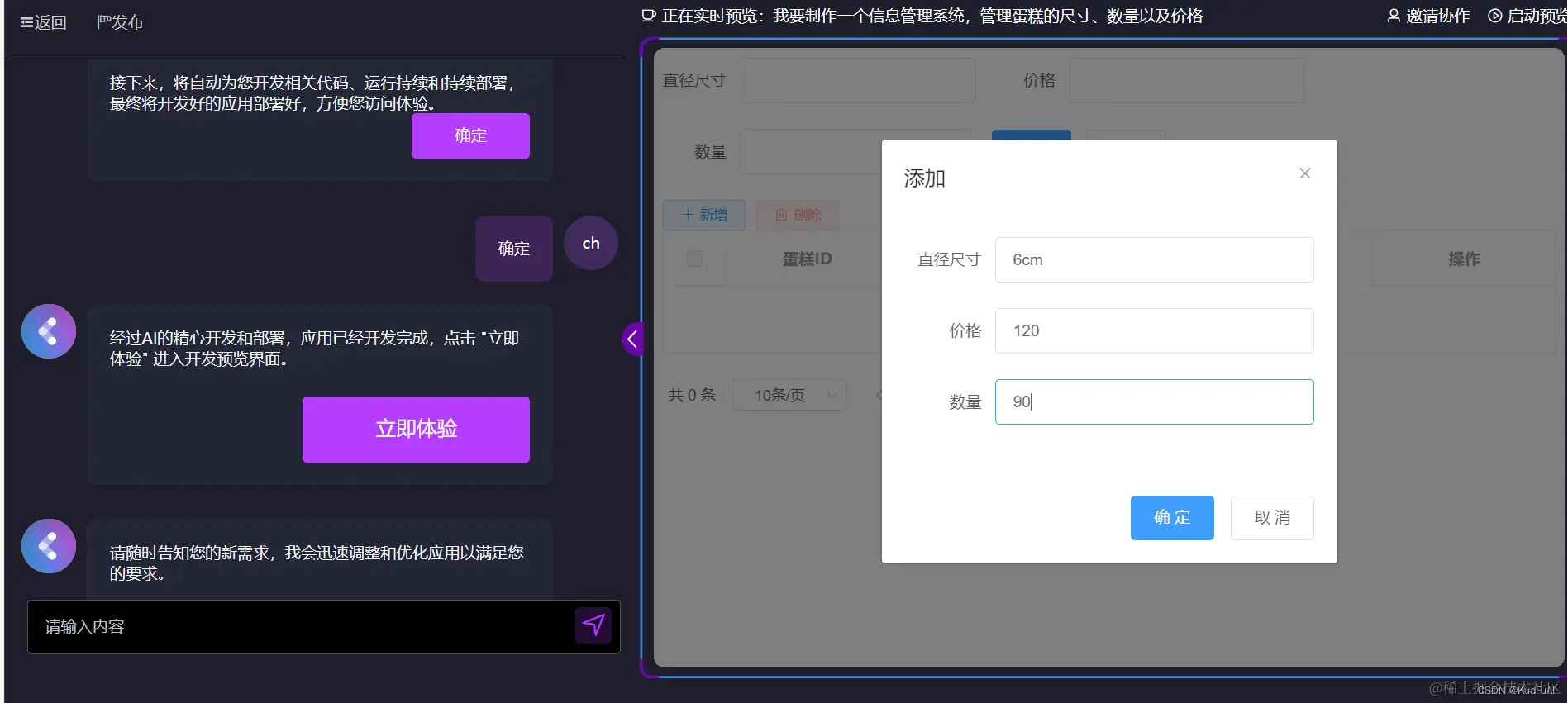 可以看到我们的 ai 还是非常的严谨的甚至反问我们蛋糕的尺寸是直径还是高度,待 ai 分析完我们的需求之后,它就会开始制作数据模型,自动开发代码,完成部署!此时我们可以点击详情进行查看,也可以直接点击确认进行下一步