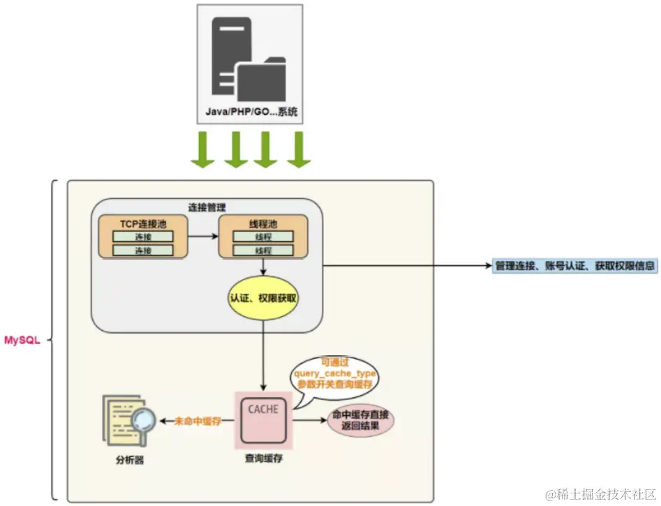 - 查询缓存:Server 如果在查询缓存中发现了这条 SQL 语句,就会直接将结果返回给客户端;如果没 有,就进入到解析器阶段。需要说明的是,因为查询缓存往往效率不高,所以在 MySQL8.0 之后就抛弃了这个功能。