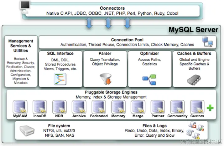 Connectors, 指的是不同语言中与SQL的交互。MySQL首先是一个网络程序,在TCP之上定义了自己的应用层协议。所以要使用MySQL,我们可以编写代码,跟MySQL Server 建立TCP连接,之后按照其定义好的协议进行交互。或者比较方便的方法是调用SDK,比如Native C API、JDBC、PHP等各语言MySQL Connecotr,或者通过ODBC。但通过SDK来访问MySQL,本质上还是在TCP连接上通过MySQL协议跟MySQL进行交互