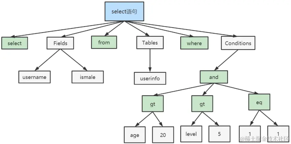 如果SQL语句正确,则会生成一个这样的语法树: