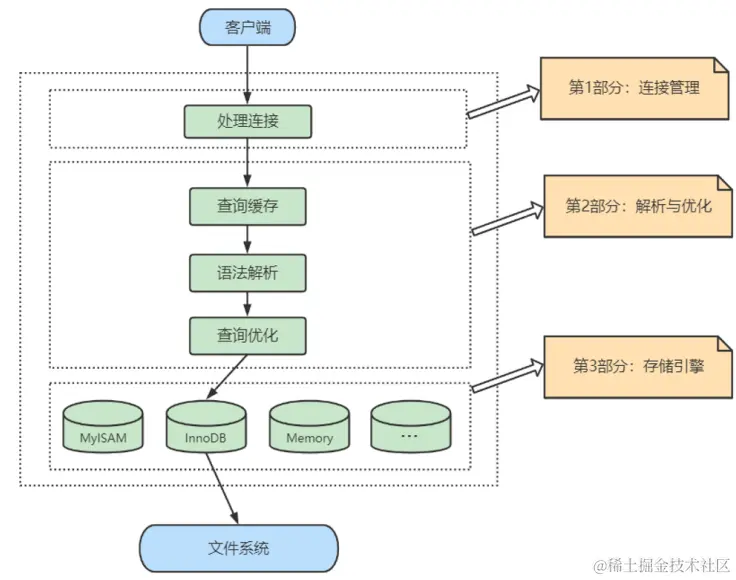 第二层架构主要完成大多数的核心服务功能,如SQL接口,并完成缓存的查询,SQL的分析和优化及部分内置函数的执行。所有跨存储引擎的功能也在这一层实现,如过程、函数等。