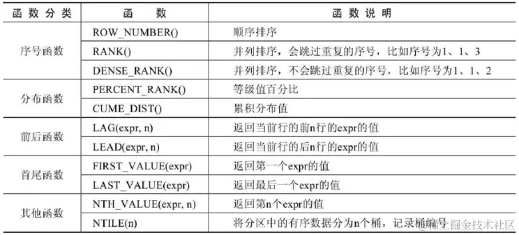 窗口函数的特点是可以分组,而且可以在分组内排序。另外,窗口函数不会因为分组而减少原表中的行 数,这对我们在原表数据的基础上进行统计和排序非常有用。