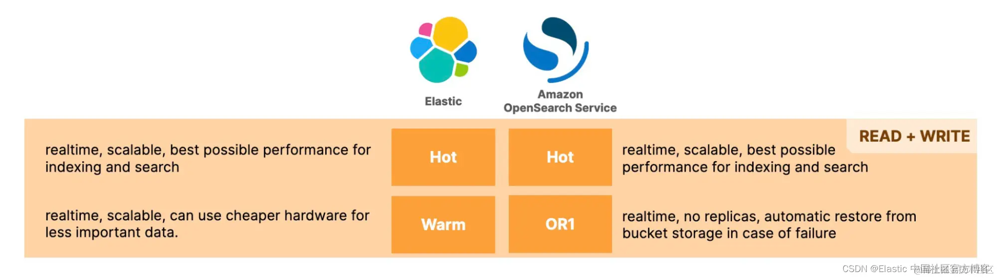 下一层,Elastic 中的 Warm 和 Amazon OpenSearch Service 中的 OR1 都允许更新数据,但在可扩展性方面存在差异 - Elastic 的 Warm 允许副本并允许你扩展以满足搜索需求,而 OR1 则不允许,因为只有主分片可用于搜索。